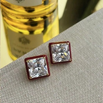 Pendientes de tuerca de esmalte rojo de circón cuadrado geométrico chapado en oro de 22 quilates de cobre Vintage francés para joyería de mujer